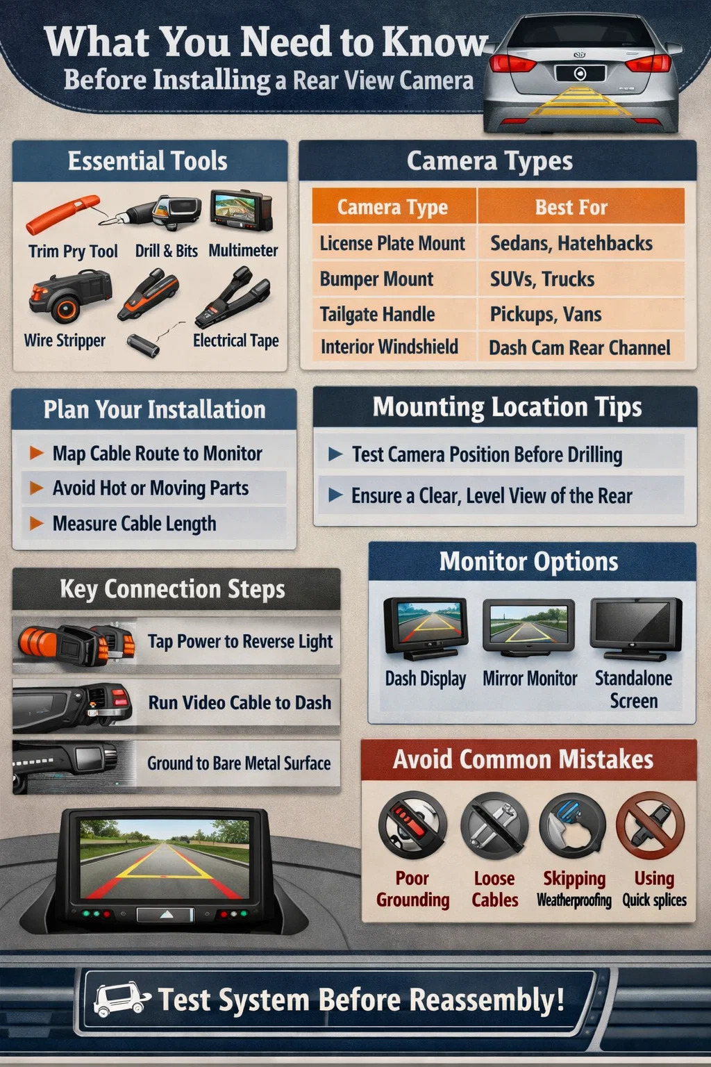 Å installere et ryggekamera for en bil er et enkelt gjør-det-selv-prosjekt som de fleste kjøretøyeiere kan fullføre i 1 til 2 timer med grunnleggende verktøy. Kjerneprosessen innebærer å montere kameraet bak på kjøretøyet, føre strøm- og videokablene gjennom interiøret og koble alt til en skjerm. Enten du jobber på en sedan, SUV, pickup eller kombi, forblir de grunnleggende trinnene konsekvente – selv om kabelføringsavstander og monteringsutfordringer varierer etter kjøretøytype.