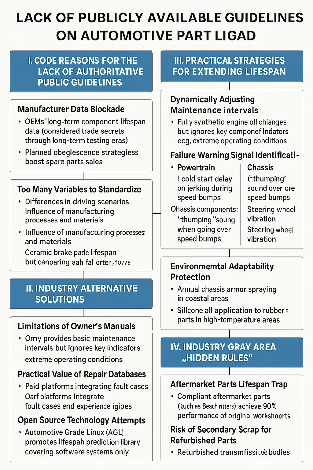I bilreparasjonsindustrien er det ingen enkelt, offentlig tilgjengelig retningslinje som dekker hele levetiden til alle bildeler . Denne situasjonen stammer fra industriens kompleksitet og påvirkning av flere variabler. Følgende er en nøkkelanalyse av disse faktorene: