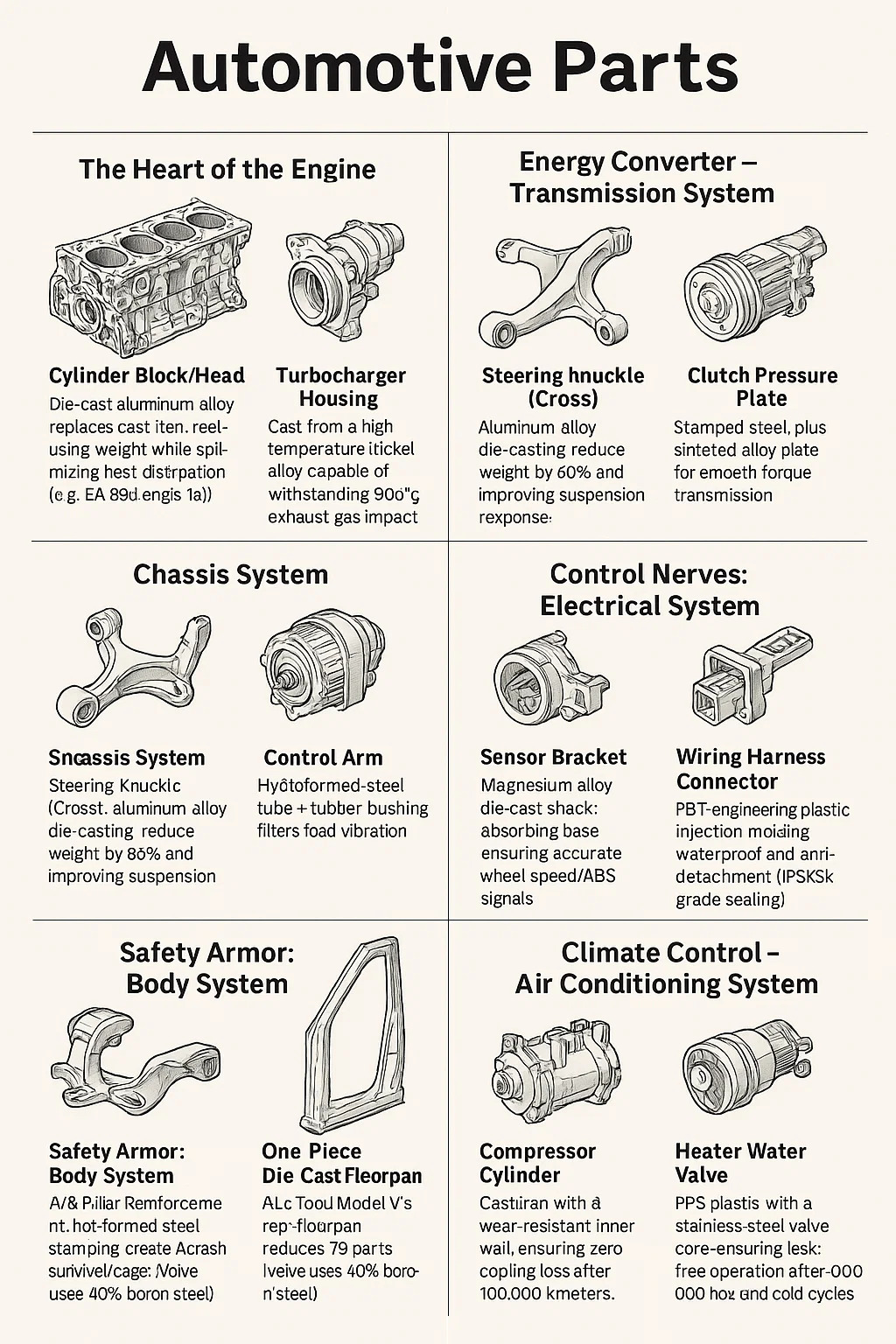 Styringsknoke (kryss): Aluminiumslegering die-casting reduserer vekten med 30% og forbedrer suspensjonsresponsen (Teslas die-støpte frontoppheng).